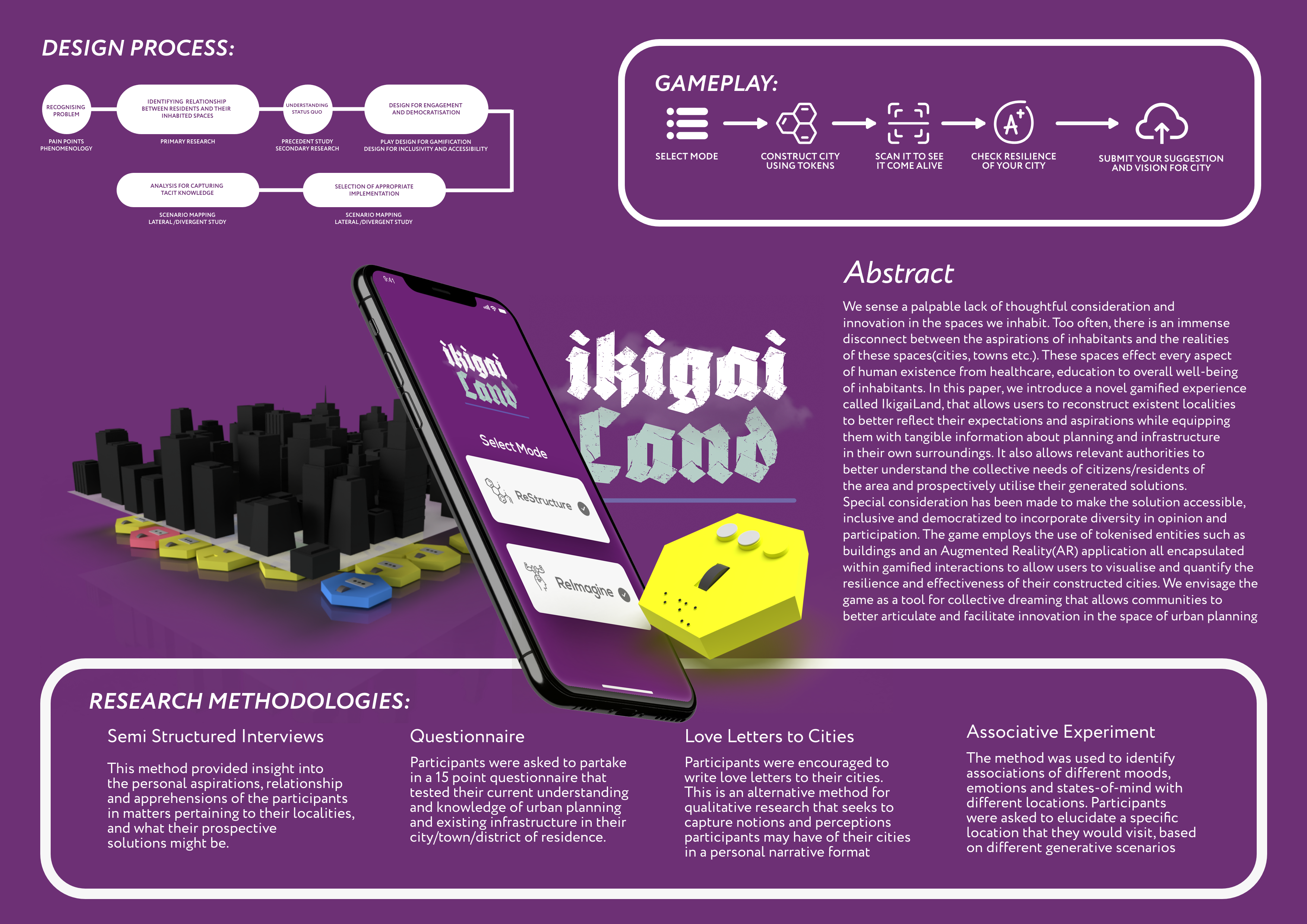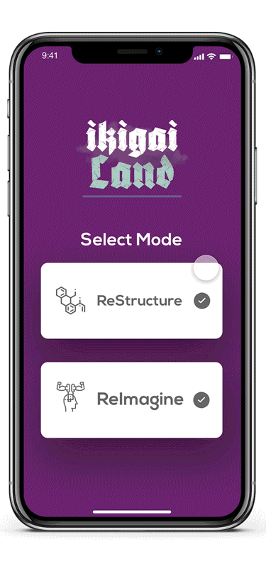IkigaiLand is a gamified urban planning experience designed for two (or more) players. The aim of the gamified experience is to construct a resilient locality while potentially exploiting flaws in the opponents’ designed locality and diminishing the opponent localities resilience. The user journey begins with the IkigaiLand app where the users must select one of two modes: ① Re-Structure Mode and ② Re-Imagine Mode.Re-Structure mode expects users to create a new layout with existing structures/entities within said locality. Re-Imagine mode allows users conceptualize completely novel layouts for a locality with buildings/entities of user’s choice by choosing the appropriate token categories and modalities.
