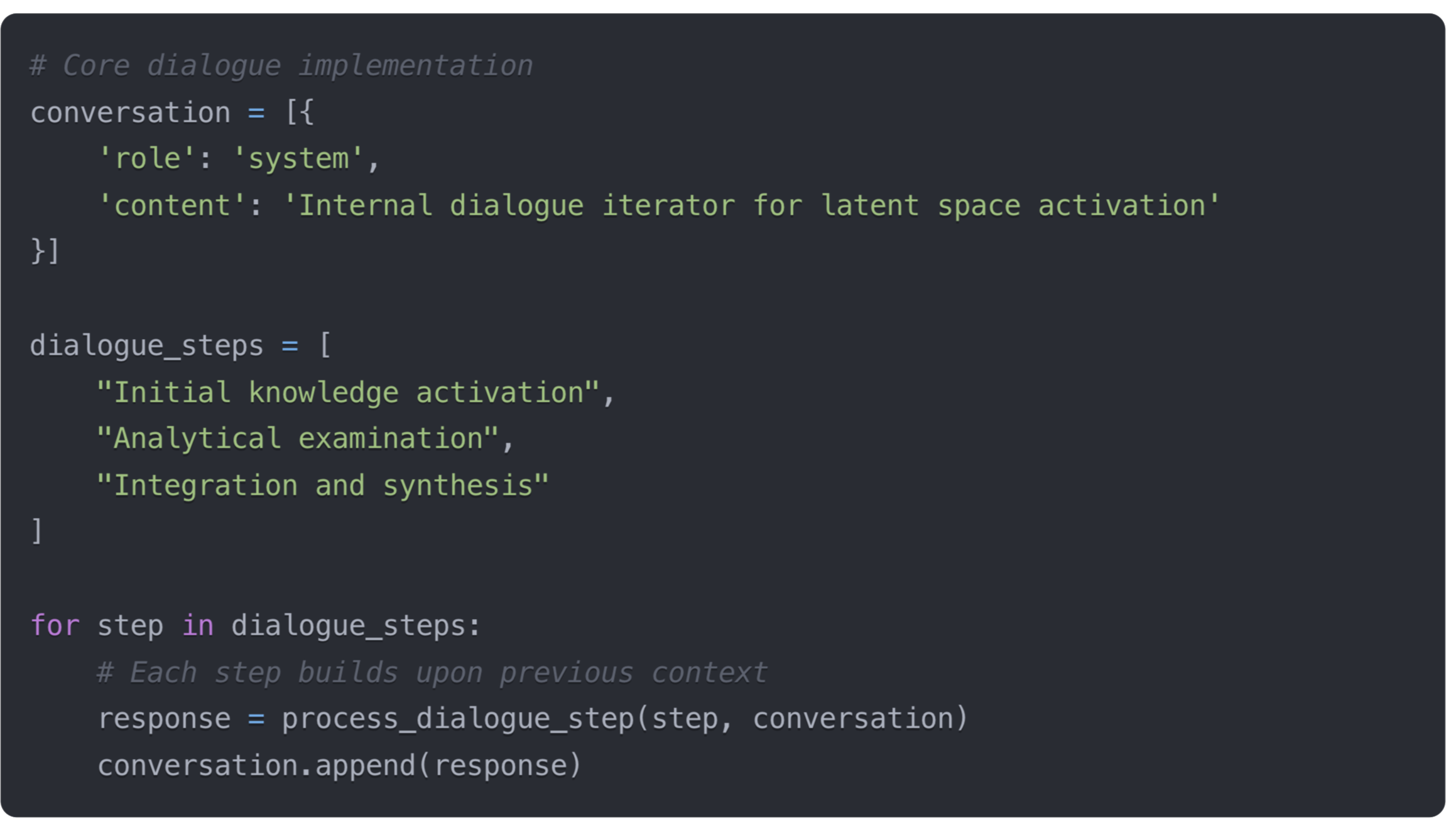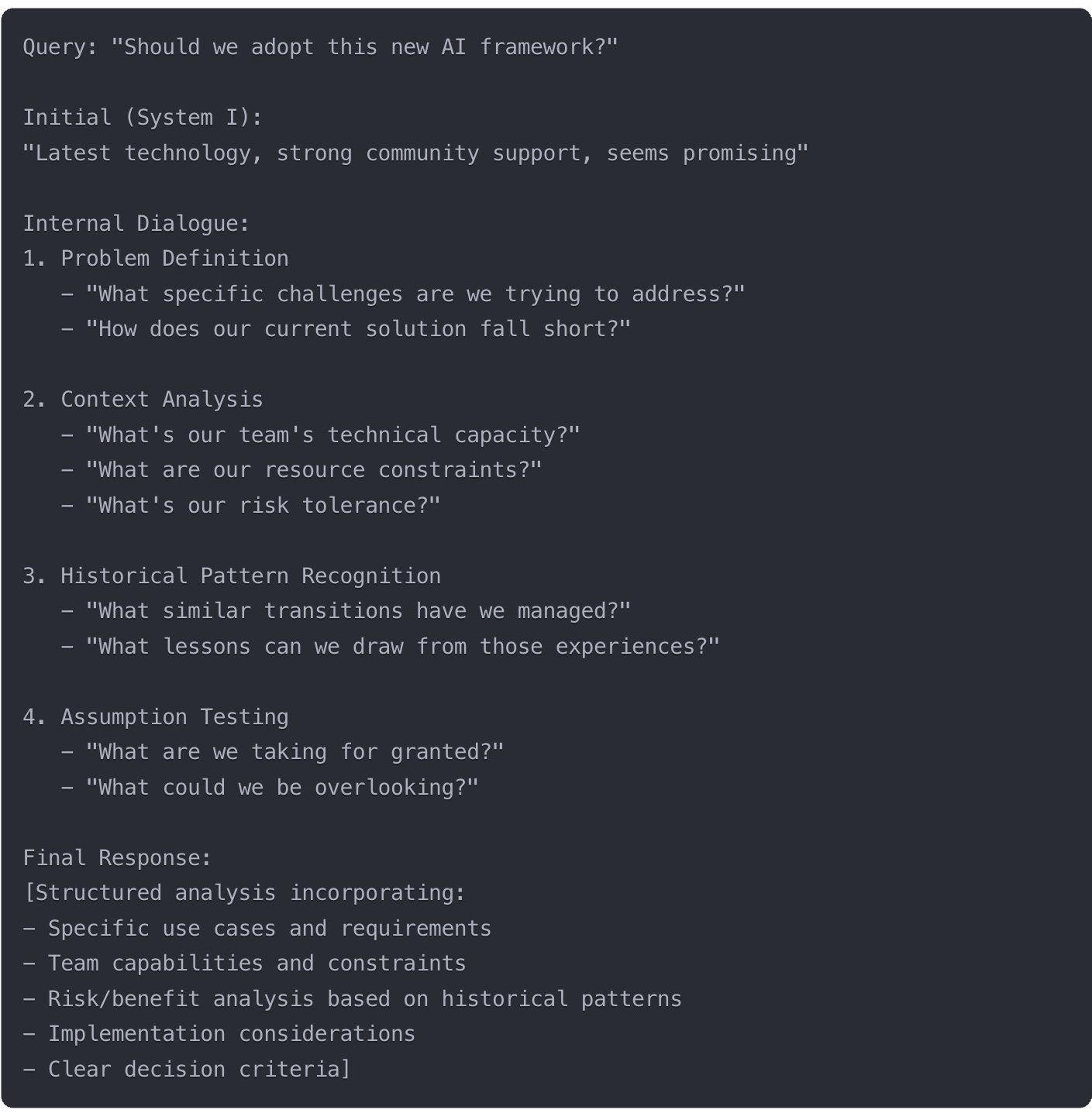 The dialogue operates as a private reasoning layer—the user never sees it. The diagram below shows this applied to a decision-making query, where the system moves from an initial intuition ("seems promising") through problem definition, context analysis, and assumption testing before producing a structured response: