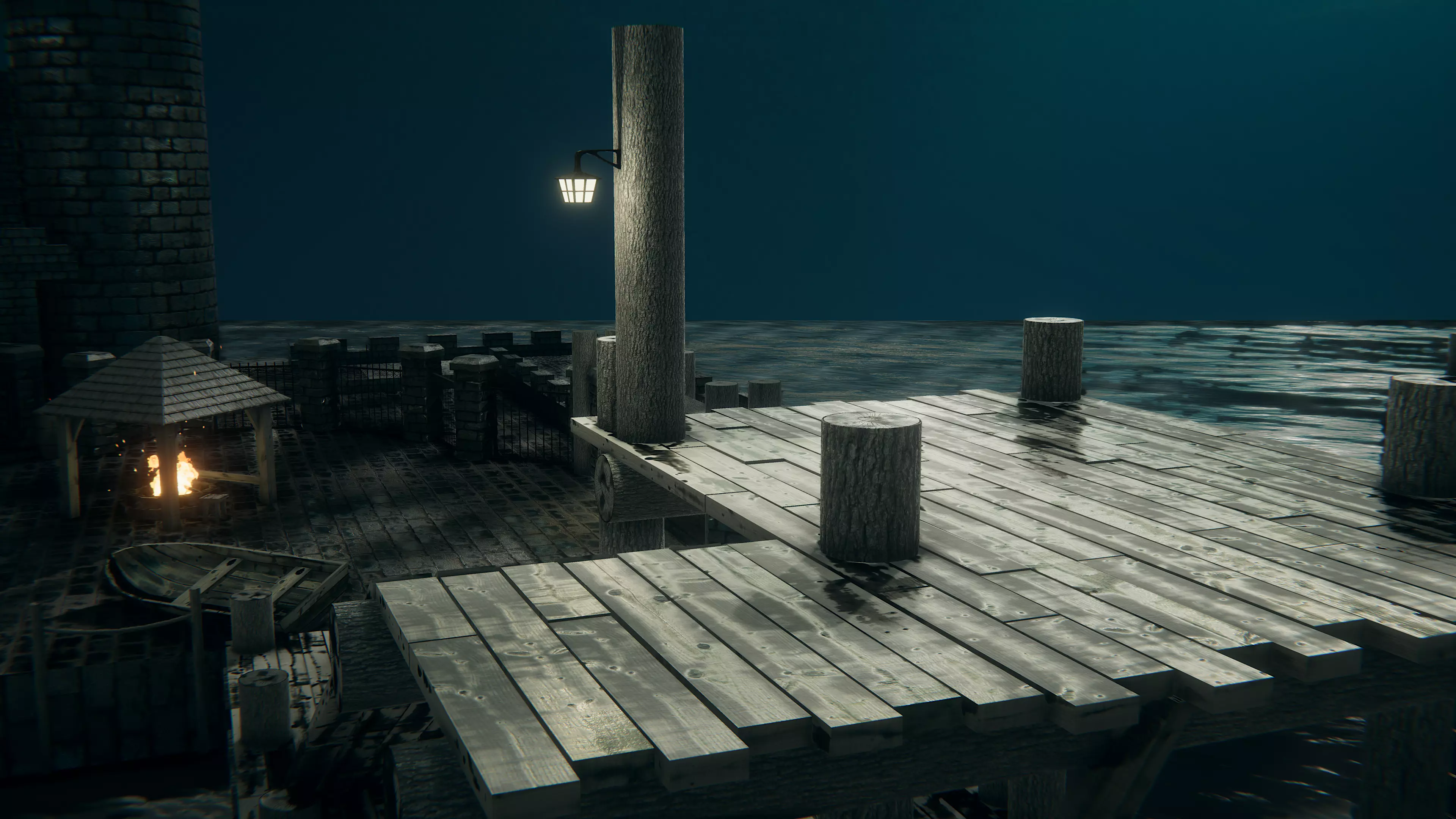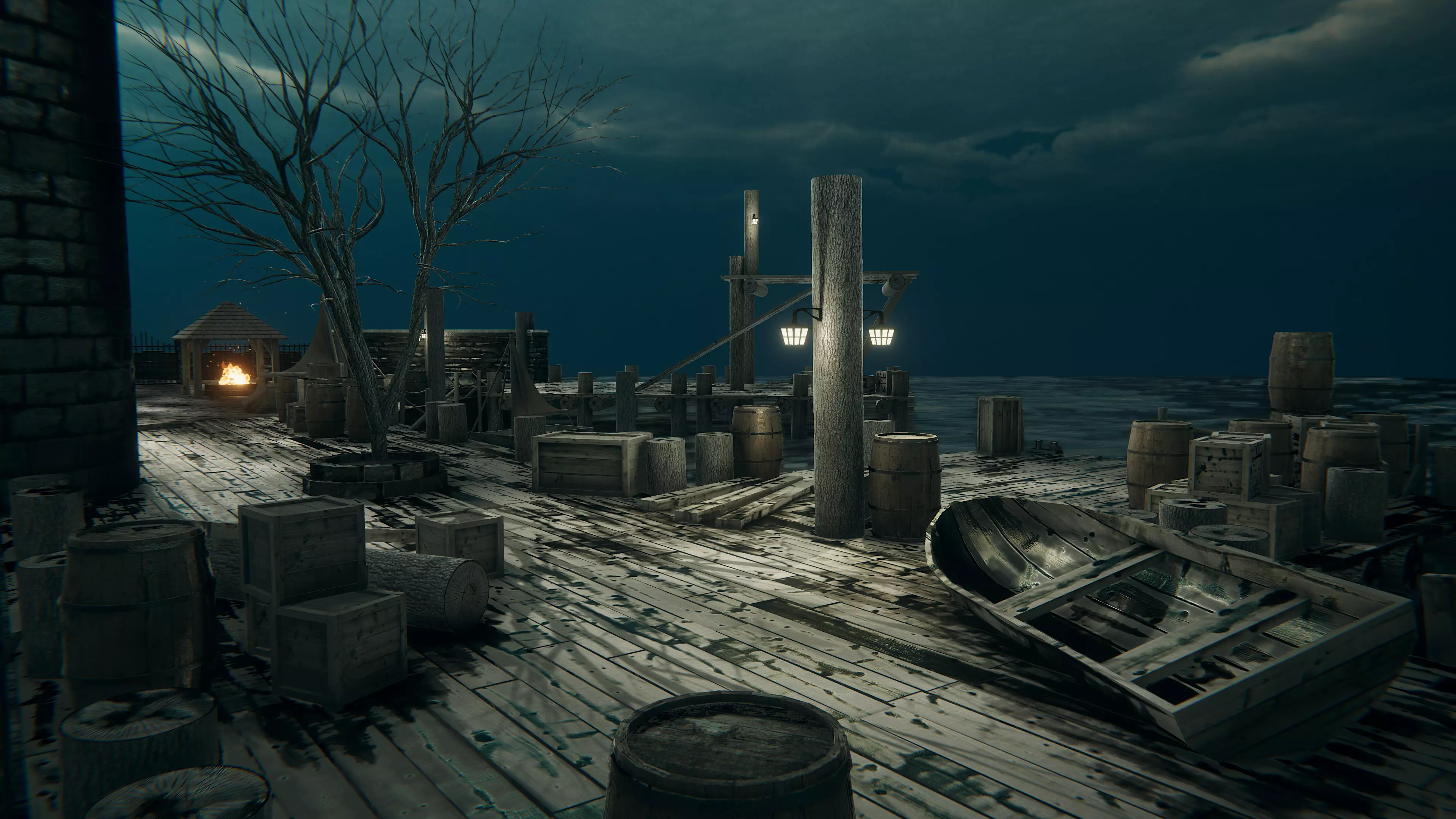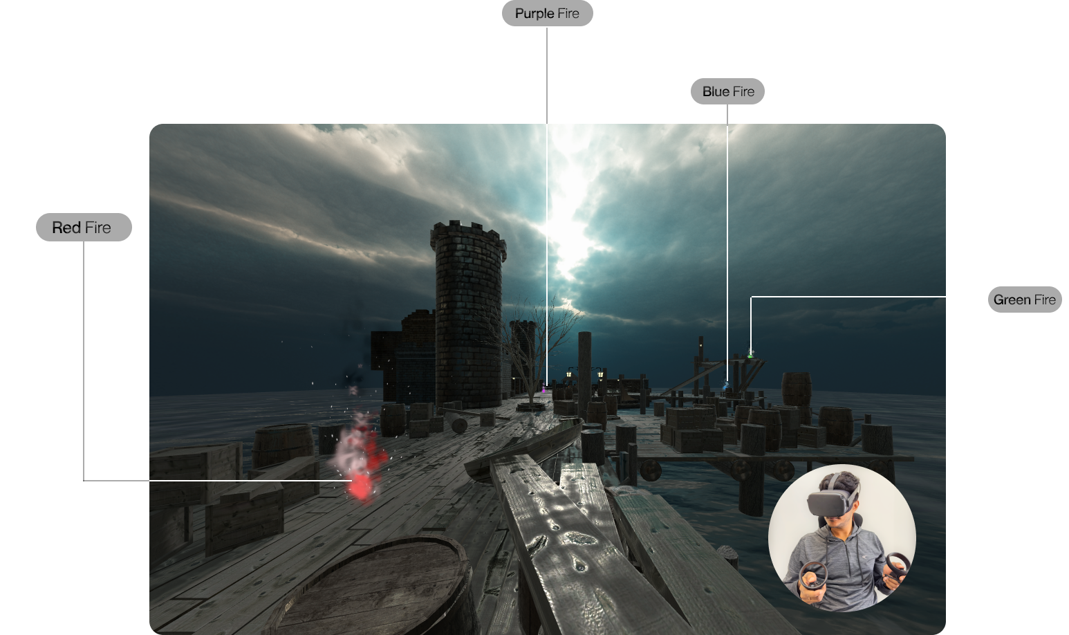 We created a rich virtual seaport environment where participants navigated between colorful fires placed strategically throughout the space. Using custom-built nGVS hardware interfaced with a Meta Quest headset, we could subtly modulate vestibular signals while participants explored. The environment itself balanced immediate landmarks like abandoned boats and towers with distant orientation cues like clouds and the sun, all accompanied by carefully designed spatial audio that enhanced presence.